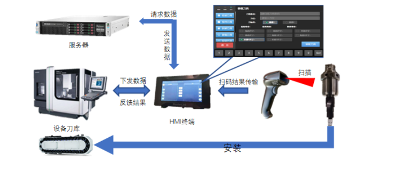 调出机床需要装刀刀位,扫描当前刀柄二维码,系统带出当前刀具数据并在HMI上显示,确认当前刀具数据后点击确认装刀,刀具数据自动写入对应刀位号信息中。