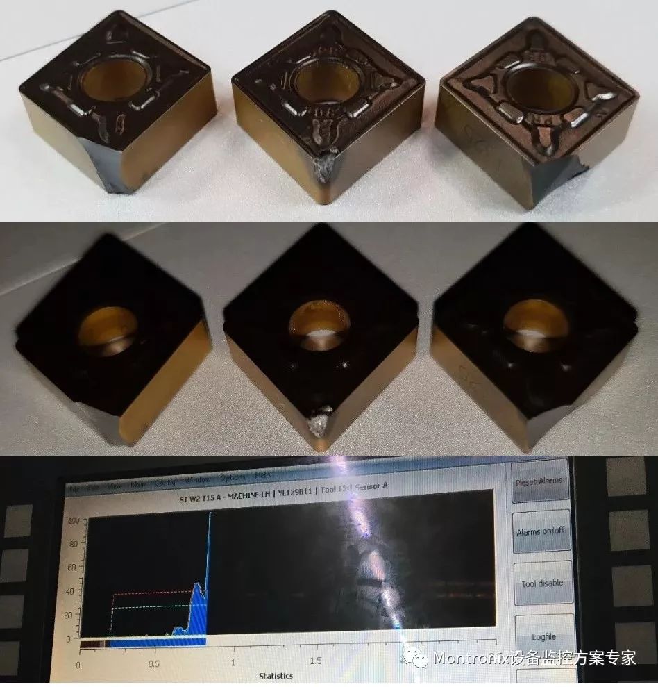 为了保证加工质量,客户工厂要求按照计数制强制换刀。然而,强制换刀避免不了两个结果: 1,为了保证加工质量,计数换刀会在工艺设计时保留一定的安全寿命,刀具还没到实际寿命就被换下来,造成了刀具的浪费; 2,刀具在加工过程中因为胚件杂质或刀具本身质量问题而提前达到极限崩刃,在未到达设计工艺寿命(强制计数寿命)前若未能及时发现,极易造成工件的批量报废。 加装Montronix刀具监控系统后,由传统的强制计数换刀改成刀具监控系统自动提醒换刀,每把刀至少可以提升20%的寿命利用率,同时也极大的降低了产品的报废率,也提高了生产效率。 |