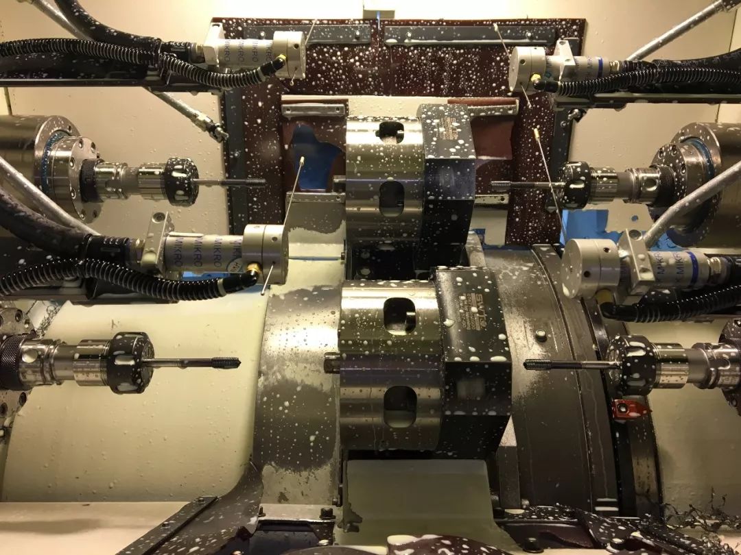 多工位流水作业专机 一共5根主轴,10个加工站,10个独立NC通道 带有二级钻刀,刀具前端钻孔,紧接着后半部攻丝 |