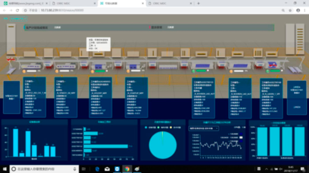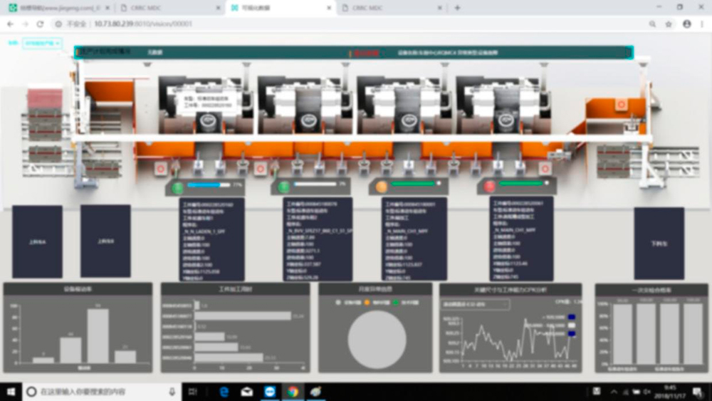 通过对采集到的数据进行分析,在看板上进行展示。零部件生产线加工实时监控。单件工件加工实时用时分析。根据工件生产序列号形成质量履历,并展示在厂房大屏上。让数据可视化展示。分析设备利用率OEE,通过和CAA系统接口,显示设备异常和物料异常的统计分析。通过设置工序时间和实时加工时间,可在零部件生产线生显示设备加工进度。