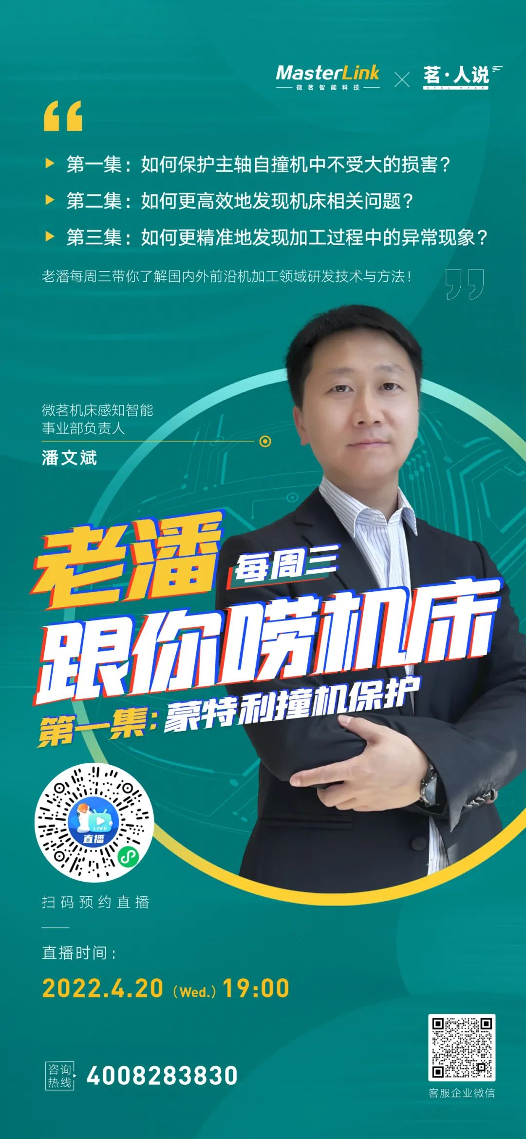 不管是关系紧密的老朋友,还是想认识我们的新朋友,诚邀来4月20日(周三)19:00微茗智能直播间听听机床感知事业部负责人—老潘跟你唠唠机床的那些事,扫码预约直播。